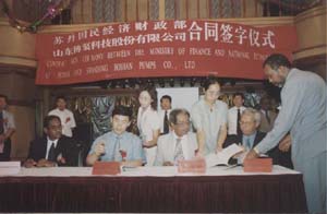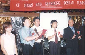 2003年8月8日,一个值得博泵人自豪的日子。这一天,以苏丹财政部秘书长ZAHER先生为首的苏丹政府代表团对我公司进行了访问,并与公司再次签订了出口水泵、灌溉设备、发电机组共1100多万美元的供货合同,同时还签署了《三方合作在苏丹组建水泵组装厂意向书》。淄博市市长刘慧晏、博山区区委书记闫西国、区长李树民等市区领导,及市区建行等有关单位领导出席了签字仪式。