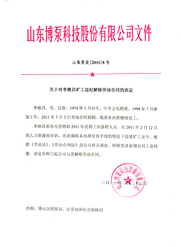 二、我公司已于二〇一一年二月二十二日与李继昌解除劳动合同关系,自解除劳动合同关系之日起李继昌的一切行为均由其个人承担责任,与我公司没有任何关系,特此声明。