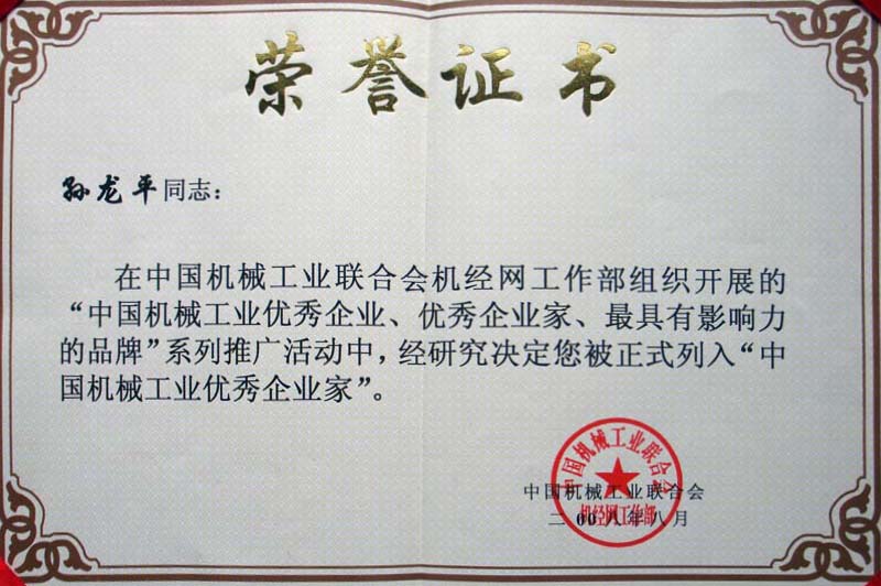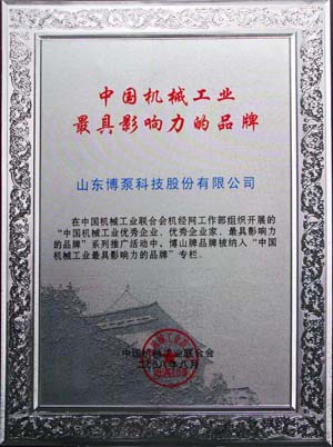 2008年8月,在中国机械工业联合会机经网工作部组织开展的“中国机械工业优秀企业、优秀企业家、最具影响力的品牌”系列推广活动中,我公司“博山牌”品牌被纳入“中国机械工业最具影响力的品牌”专栏,董事长孙龙平同志被正式列入“中国机械工业最具影响力的品牌优秀企业家”。